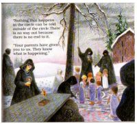 She dries her little-girl tears and thanks to Gibson, from somewhere real, inside the character, come two riveting eyeballs trained on them and a voice of doom that “spooks” even the hardened enslavers. She then “reveals the end” of all that they represent; in Greek, she “apocalyptizes” the final things.